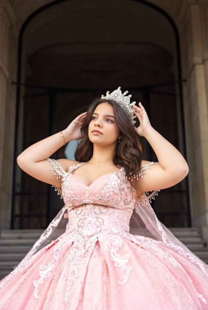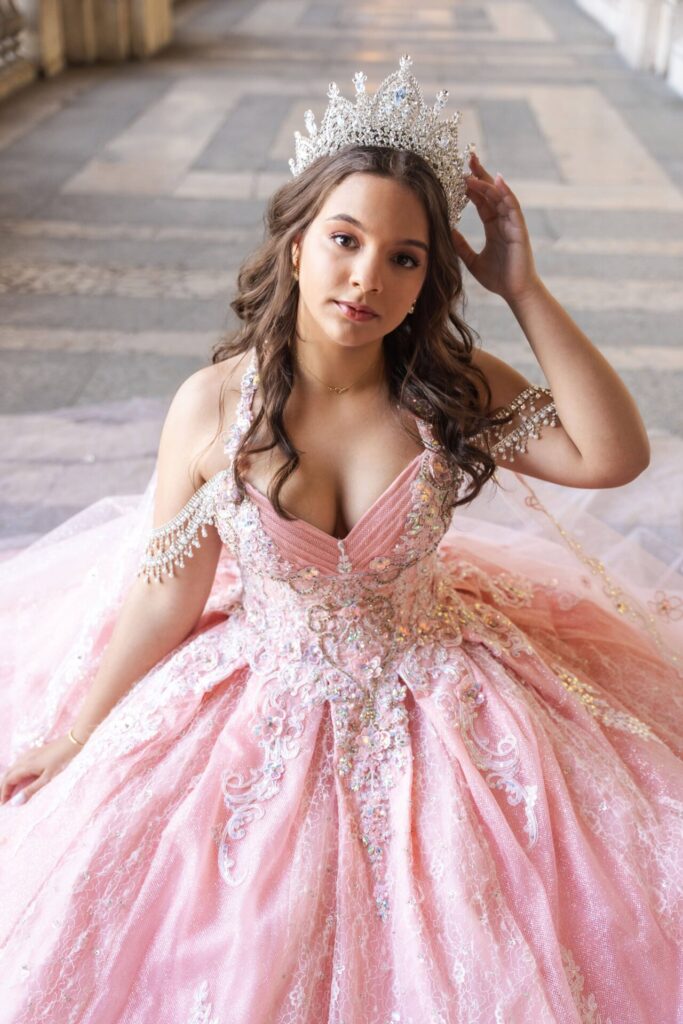 The Rose Aurora Princess Dress is a statement in every sense. A warm rose ball gown covered in iridescent crystal appliqués and intricate lace embroidery, with off-shoulder straps draped in cascading rhinestone chains that frame the bodice like jewellery.